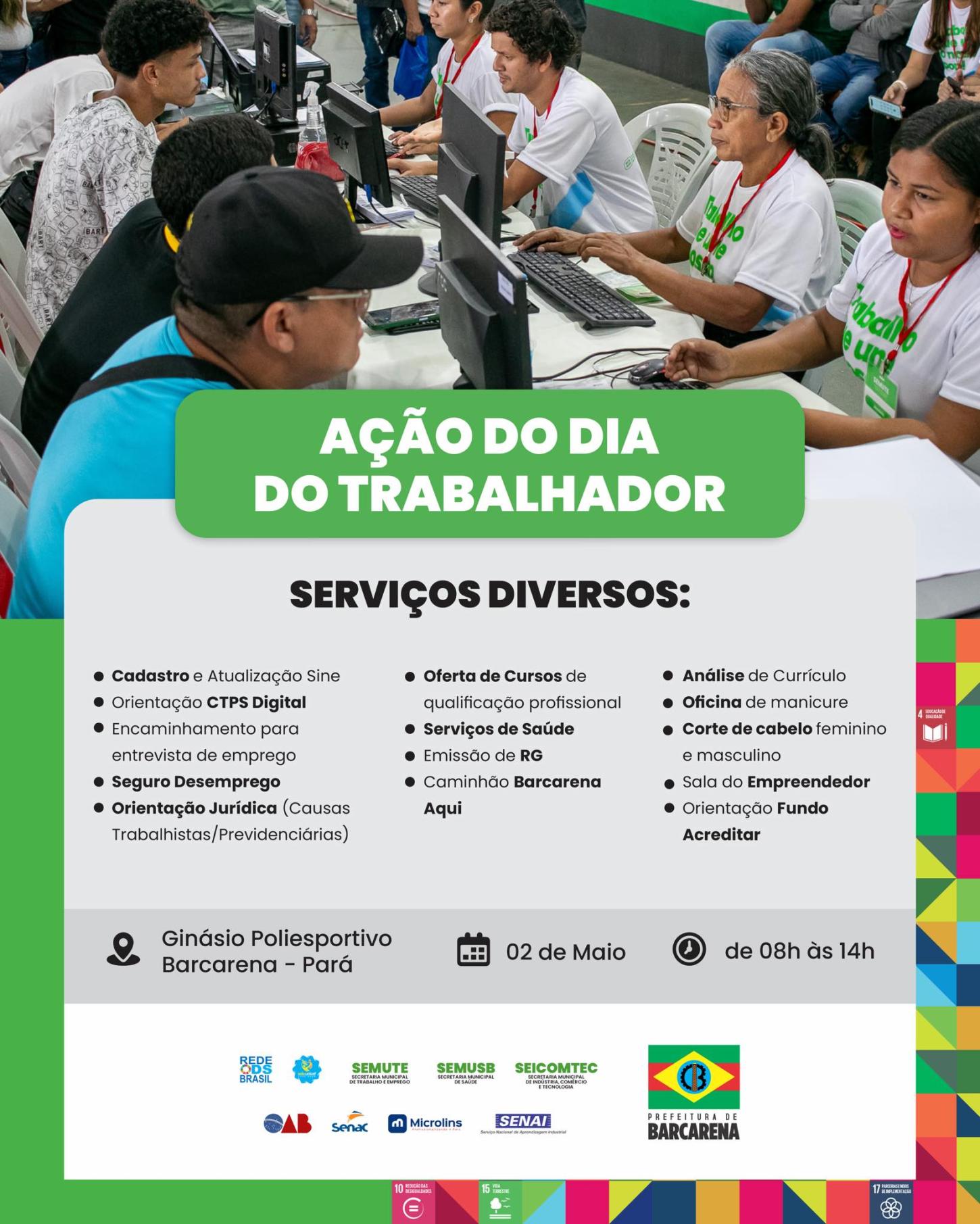 Será um dia com vários serviços de saúde, emissão de RG, orientação jurídica, corte de cabelo, inscrição em cursos e muito mais. Na quinta-feira, 2 de maio, no Ginásio de Barcarena-sede, a partir das 8h.